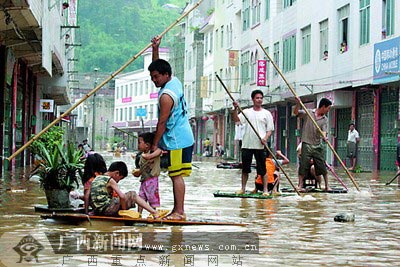 內澇淹城鎮(zhèn),居民進出很不方便。凌云縣有關部門調派了卡車和沖鋒舟,供沿線居民進出。記者看到,許多進城鎮(zhèn)小車被擋在外面,兩輛卡車由于涉水能力強,負責運送過往的村民和物資。有的市民自制竹伐或涉水工具,渡“河”出行,有的居民還牽出馬來,騎馬過“河”。