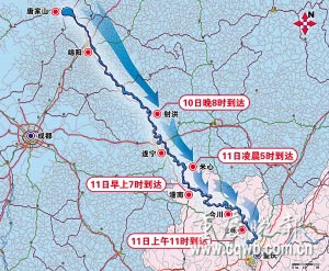 唐家山堰塞湖下瀉的洪水正向重慶奔來,預(yù)計(jì)今日凌晨5時(shí)進(jìn)入(重慶)潼南米心鎮(zhèn),今上午11時(shí)到達(dá)北碚。