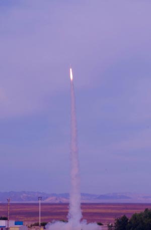 “3,2,1,點(diǎn)火!”昨天上午8時(shí),酒泉衛(wèi)星發(fā)射中心。一聲令下,北京航空航天大學(xué)宇航學(xué)院學(xué)生王虹玥沉著地按下了電子點(diǎn)火按鈕!班亍钡囊宦,“北航一號(hào)B”火箭尾部瞬時(shí)噴出一股耀眼的火焰,箭體呼嘯而出,留下一道白煙直刺入萬米高空,在廣袤的西部沙漠中,伴隨著一輪噴薄而出的紅日,鐫刻成一幅完美的畫面。
