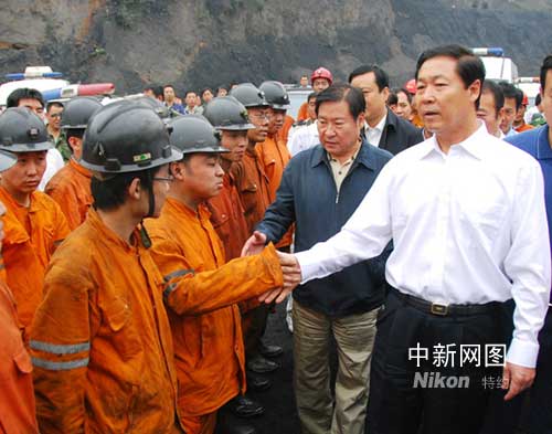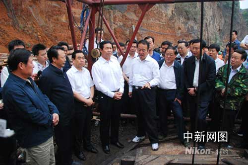 6月14日10時,國家安監(jiān)總局局長王君、國家煤礦安全監(jiān)察局局長趙鐵錘(后者)、山西省省委書記、省人大常委會主任張寶順(前者)趕到事故現(xiàn)場,到井口差察看,并詳細(xì)詢問搶救進(jìn)展情況。作者:張建益