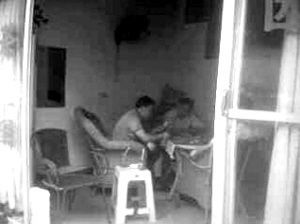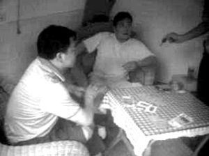 網(wǎng)友“善良老百姓”還在論壇里貼出兩張抓拍的照片:兩名穿藍(lán)色T恤的男子,拿著撲克坐在桌前,桌上散亂地鋪著現(xiàn)金;第三人的面目沒出現(xiàn)在畫面里,但可以見到其伸出的一只手。從照片的畫面判斷,拍攝者當(dāng)時(shí)站在房間外。
