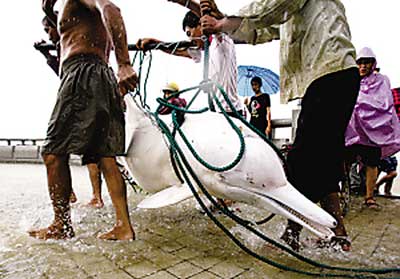 下午4時10分,村民們將白海豚抬到岸上(見左下圖)。半個小時后,白海豚被裝上汽車送往廣州。