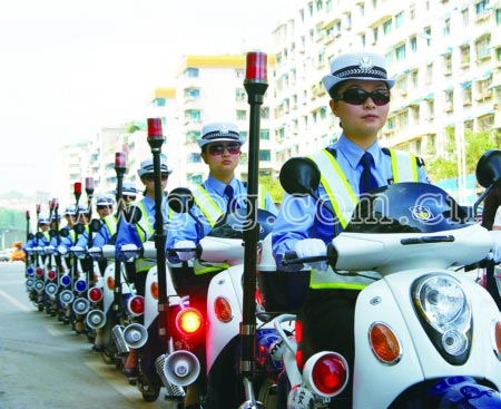 通過嚴格的文化、體能、技能考試和政審后,(貴州)畢節(jié)市交警大隊從畢節(jié)地區(qū)8個縣(市)公安系統(tǒng)考調(diào)10名“警花”組建了首支女子交警隊。經(jīng)過三個多月的封閉訓(xùn)練,近日,10名美麗漂亮的“警花”正式亮相畢節(jié)街頭,開始在畢節(jié)城區(qū)進行交通巡邏、維護交通秩序等交通執(zhí)法活動。