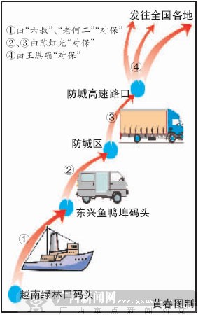 為進(jìn)一步降低風(fēng)險(xiǎn),陳虹光也如法炮制,將從越南碼頭到防城倉庫一段,“對(duì)!苯o東興人“六叔”、“老何二”(另案處理)。