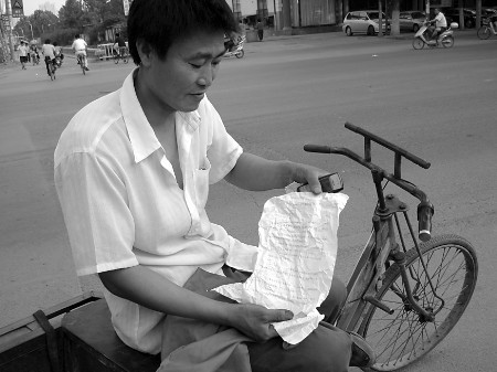 下午5點(diǎn)55分,記者終于見(jiàn)到了馬師傅,他看上去老實(shí)本分,裝扮樸素,鞋和褲子都已經(jīng)破了,蹬著一輛破舊的三輪車,眼睛有些紅腫,在接受民警詢問(wèn)的時(shí)候,還不時(shí)惦記著回家收自己的菜攤。