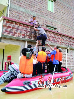 昨日下午4時(shí)許,筆者在該縣播植鎮(zhèn)龍福村委看到,屬下的龍村、羅榕、灣頭等10條村莊已是一片澤國(guó),村道一端和樓房上零星散布的村民正在等待救援,幾艘沖鋒舟和橡皮艇來(lái)回穿梭,把村民們載到安全地帶(如右圖)。從市里全會(huì)請(qǐng)假回來(lái)的縣委書記譚培安也親臨“澤國(guó)”指揮救援,數(shù)十名縣鎮(zhèn)領(lǐng)導(dǎo)干部正在現(xiàn)場(chǎng)忙碌,村中還不時(shí)傳出如放鞭炮般的倒房聲。一位剛剛被救出的80歲的阿婆說(shuō),活這么大歲數(shù)還未見過(guò)如此大的暴雨和山洪。據(jù)悉,該鎮(zhèn)前日起遭受暴雨襲擊,導(dǎo)致當(dāng)?shù)貝偝呛臃簽E,河基崩潰嚴(yán)重,河水倒灌入村,受浸村莊10多條,受困村民2526人,倒塌房屋117戶352間。前晚起,縣、鎮(zhèn)、村干部齊出動(dòng),分頭深入受災(zāi)村莊連夜動(dòng)員村民撤離,至昨日下午,已全部安全轉(zhuǎn)移。(圖/文談細(xì)育龍?jiān)S李均陽(yáng))