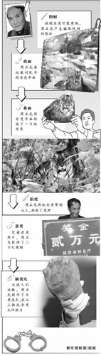 根據(jù)周正龍的供述,公安機(jī)關(guān)從其家中提取了去年10月3日拍攝假虎照時(shí)所用的老虎畫1幅、木質(zhì)虎爪模具1個(gè)。從為其提供老虎畫的曹某家中提取了同時(shí)購(gòu)買的另一幅相同的老虎畫。