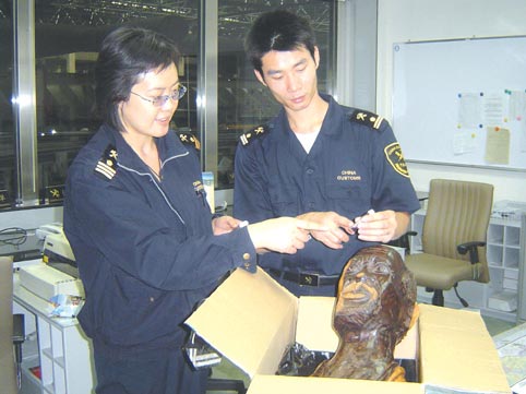 有一次,廣州海關(guān)在一件工藝品中查獲毒品,該工藝品呈圓盤狀,是用樹脂材料制成的頭像,整個工藝品渾然一體,毒品都藏匿其中,表面沒有一絲破綻,并且在圓盤的周邊都沒有藏匿毒品,所有的毒品都藏匿在頭像面部的突起部位。(記者蔡巖紅)
