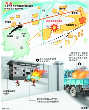據(jù)張家界警方初步查明,該辦事處彭家巷社區(qū)七組居民田開友,因?qū)ψ约疫`法建筑被有關(guān)部門依法拆除產(chǎn)生不滿,于昨日上午駕駛一輛裝有兩個已點燃的液化氣瓶的農(nóng)用三輪車沖進(jìn)辦事處院內(nèi),在辦公樓前發(fā)生爆炸,爆炸產(chǎn)生的沖擊波造成12名干部和群眾受傷。田開友在案發(fā)5分鐘后被警方抓獲。據(jù)了解,西溪坪街道位于張家界市區(qū)東部,東臨慈利縣金巖,南連大坪鎮(zhèn),西接官黎坪街道辦事處,北有澧水河與陽湖坪鎮(zhèn)相望,是張家界市新興的旅游工業(yè)開發(fā)區(qū),人口3.53萬人,轄23個建制村、3個居委會。