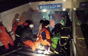 消防在清除地鐵5號(hào)線崇文門站的積水。