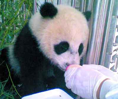 “功夫熊貓”,在省大熊貓搶救中心拒絕人工喂養(yǎng)。工作人員說,野生大熊貓1歲左右的死亡率為60%多,“功夫熊貓”生命堪憂。