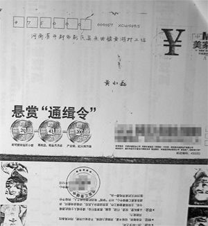 進門后,黃明華看到二老呆坐著,手里拿著“通緝令”。他打開信封,里面其實是鄭州一家房地產(chǎn)公司的廣告。上面寫著“懸賞通緝”,左右兩側(cè)分別有3個人頭素描,“很像通緝犯”。