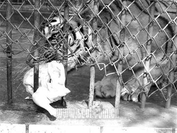 十指連心,動物也不例外。虎掌鋸爪,猶如虎口撥牙。要想成功為“園園”實(shí)施剪指甲手術(shù),必須實(shí)施麻醉。前日上午10時(shí),技術(shù)人員趁“園園”不備,用長竹竿綁上一顆大針頭,將4只陸眠靈麻藥快速推進(jìn)虎體。15分鐘后,“園園”雙眼時(shí)閉時(shí)睜伏在地上。不料,30分鐘后,“園園”突然起身,東倒西歪地走了起來。“看來藥量太輕,未能完全將它麻醉。”10時(shí)38分,技術(shù)人員為“園園”補(bǔ)了一支麻藥,體重約150公斤的東北虎,兩腿一軟倒在地上再也爬不起來了。2名工作人員抓住時(shí)機(jī),快速將“園園”的右腿拖出鐵欄外,并用繩索牢牢捆綁住虎掌,用鋼絲鉗將虎爪因定。只聽一陣“嘩!嘩!嘩”的拉鋸聲,一名工作人員就像鋸鋼管一樣,奮力朝著虎爪的第二只指甲猛鋸!拔!嗡!”就在工作人員即將鋸掉首枚虎爪時(shí),劇烈的疼痛感將休眠中的“園園”痛醒,連續(xù)發(fā)出兩聲怒吼的同時(shí),全身一陣猛抖,欲掙脫束縛拖回被綁的右掌。然而,5支麻藥的藥效已使此時(shí)的東北虎有心無力,徒勞一陣后進(jìn)入夢鄉(xiāng)。