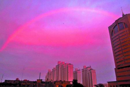 19時28分開始,彩虹的右下弧段最先形成,然后左下弧段相繼出現(xiàn),最后弧頂部分連接左右兩端,形成一個完整的大彩虹,高高懸掛在新鄉(xiāng)市區(qū)東南方位的上空。彩虹外紅內(nèi)紫,色彩鮮艷。
