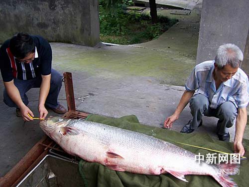 中新網(wǎng)杭州7月20日電(記者龔讀法 通訊員龔一磊) 日前,浙江省杭州千島湖發(fā)展有限公司捕撈隊(duì)在千島湖宅上攔網(wǎng)上捕獲特大鱤鰍魚一條.該魚長(zhǎng)165cm,胸圍91cm,重54公斤,是近年來(lái)捕獲的最大鱤鰍魚,同時(shí)也是今年以來(lái)千島湖內(nèi)捕獲的第三條超百斤的大魚。目前,該鱤鰍魚已送上海水產(chǎn)大學(xué)制作標(biāo)本。