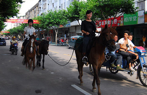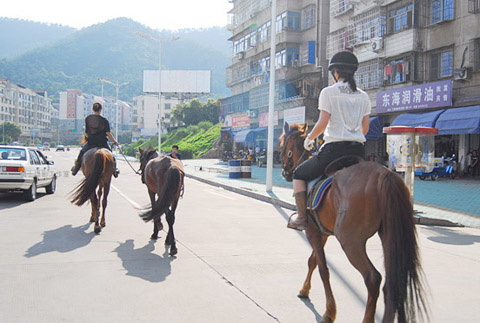 連日來的傍晚時分,只要天氣晴好,(浙江)諸暨最繁華的街區(qū)就會出現(xiàn)這樣一副場景:兩三名時尚男女,身穿騎師服裝,騎著高頭大馬,旁若無人地在車流中穿行。途經(jīng)之處,總引得好奇市民拿起手機、相機一通抓拍。