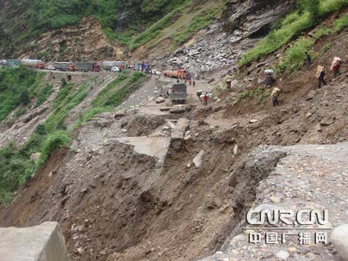 不到兩天時間,公路中段造成前后兩端400輛車輛受堵,排起長龍,上千人被困。運送生活物資只能靠武警交通二支隊官兵臨時利用圓木和預(yù)制板搭建的人行通道快速通過。另外,公路中段造成樟木口岸油料緊缺,給搶險保通帶來一定影響。西藏交通部門連同中交一勘院專家組和負(fù)責(zé)搶險保通任務(wù)的武警交通第二支隊,迅速組成搶險保通指揮部,緊急商討制定施工方案。由于濃霧、山體滑坡繼續(xù)擴大,加之不間斷的強降雨等眾多不確定因素,給整個搶通工作帶來相當(dāng)大的難度。