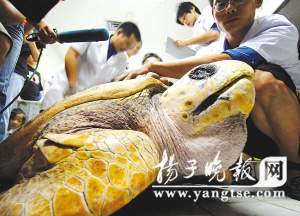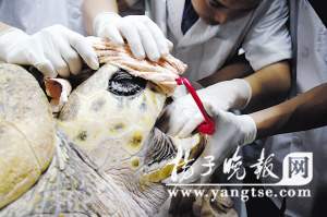 要說手術,談何容易,海底世界水族館的獸醫(yī)說,像這樣的手術他們也還是第一次做,沒有任何資料可以參考。“是最耐心、難度最大的一次,作為冷血動物的大海龜,它的結構和人體完全不一樣,我們原來不太了解海龜的結構!
