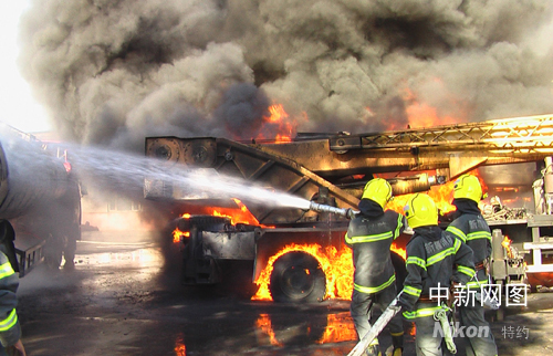 一中隊(duì)于09時(shí)34分到達(dá)火災(zāi)現(xiàn)場后經(jīng)觀察及詢問知情人,停車場院內(nèi)1輛載重28.58噸凝淅油油罐車和3輛吊車著火,鄰近的另外3輛吊車、20余輛貨車及汽車修理鋪受到威脅,油罐隨時(shí)發(fā)生爆炸,如不及時(shí)控制火勢,造成的后果將不堪設(shè)想。