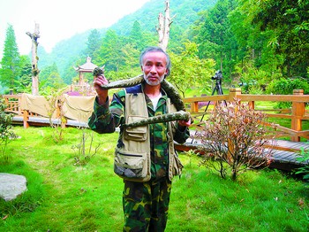 至今,他的左手中指只剩下最下面一節(jié),那是2003年一條莽山烙鐵頭蛇送給他的“禮物”。當(dāng)年8月,陳遠(yuǎn)輝將人工孵化的莽山烙鐵頭蛇拿到“鬼王寨” 放生。一條蛇在身體接觸地面后,突然轉(zhuǎn)過頭來,狠狠地咬住了陳遠(yuǎn)輝的左手中指。為了拍攝到蛇咬人的珍貴鏡頭,陳遠(yuǎn)輝竟用右手拿著DV拍了近5分鐘才將蛇甩開。(特派記者 劉軍)