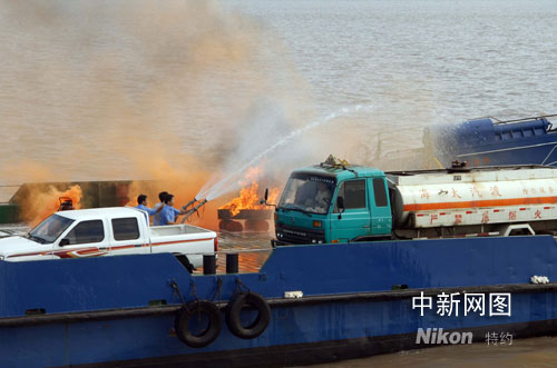 在演習(xí)模擬現(xiàn)場,“海太七號” 在正常航行途中,甲板水手長突然發(fā)現(xiàn)一車上人員提著一只裝有燃料油的塑料桶下車,飛快走向一輛裝有甲醇危險品的車輛,將手中的汽油灑向甲醇車,掏出打火機(jī)、點燃大火。他跳上裝有甲醇的槽罐車開啟閥門,讓甲醇泄漏,企圖制造更大的恐怖事件。渡船船員迅速與恐怖分子展開搏斗,組織滅火,并將險情向海門市政府和南通海事局交管中心報告。