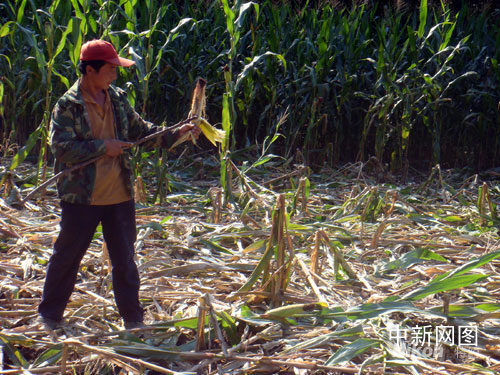 村民在查看被野豬損壞的莊稼。蒼雁 攝