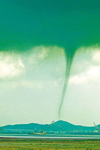 “太壯觀了!龍卷風(fēng)在海面上吸起500多米高的水柱,一時間水柱和天上的烏云連接在一起!钡谝淮慰吹健褒埼逼嬗^的虞先生在電話中依然顯得特別興奮。昨天上午10時20分左右,在定海區(qū)馬岙鎮(zhèn)上班的虞先生,遠遠看到岱山縣秀山常石集團附近有一片烏云。不一會兒,烏云中忽然伸出一條黑色水柱,直指海面。隨后,水柱越來越粗,并且略微移動。當(dāng)時他意識到,這應(yīng)該是龍卷風(fēng)了,也就是傳說中的“龍吸水”!整個過程大概持續(xù)了10分鐘不到,之后烏云就散去了。
