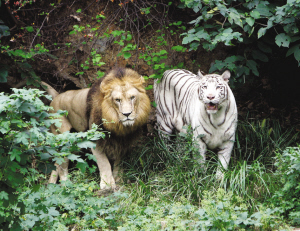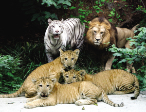 據(jù)了解,獅虎獸的父母是一只雄性非洲獅和雌性孟加拉白虎“小雪”,都是2002年在紅山動物園出生的,一起生活在“獅虎生態(tài)園”,感情很好。當初跟它們一起關進園里的還有另外五只猛獸,包括兩只母獅,一公一母兩只虎,以及一只母白虎?墒沁@只雄性非洲獅就是喜歡跟“小雪”待在一起,對自己的同類——兩只母非洲獅反倒不理不睬。后來,工作人員先后移出了兩獅兩虎,園里只留下“小雪”、雄性非洲獅,和一只母東北虎。園子里“太平”了,“小雪”跟它的獅“哥”更是形影不離,親密不已,那只母東北虎成了“電燈泡”。