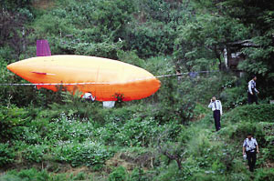 25日下午3點,岷山昆明制藥廠內(nèi),一“不明飛行物”突然闖入,降落在半山腰上,周圍近百住戶上山圍觀,一些人以為是UFO,數(shù)輛警車載著近30名警察趕到現(xiàn)場。其實,“不明飛行物”只是一艘普通的飛艇,是某航模公司與某火電廠架設高空電線用的,因為下雨,遙控器失靈,發(fā)動機停止工作,最后落了下來。(據(jù)都市時報)