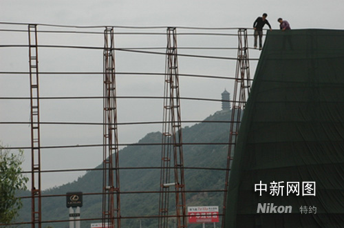 工人在浙江臺(tái)州一國慶車展現(xiàn)場(chǎng)加固施工,以應(yīng)對(duì)超強(qiáng)臺(tái)風(fēng)“薔薇”的到來。作者:陳林聰
