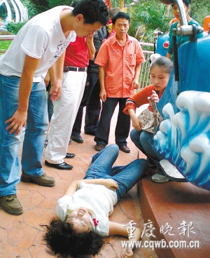 “有人墜地了!”周圍響起叫喊聲。卡在保險杠和座位之間,身子懸在半空的凌澤坤這才發(fā)現(xiàn),李鳳躺在游藝機旁邊的地上。游藝機經(jīng)過一圈減速后,很快停下來。凌澤坤趕到李鳳身邊,只聽見李鳳說聲“頭痛”就昏過去。動物園管理人員和傷者家屬一起把傷者送到九龍坡區(qū)第一人民醫(yī)院接受治療。