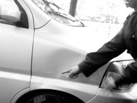 昨日15時(shí)40分,記者來到位于正義路市公安局對(duì)面的輔路上,只見一名30來歲的青年男子倚在警車旁邊,大半個(gè)身子倒在地上意識(shí)迷湖,民警正在一旁詢問情況。警車的身后停著三輛有城管標(biāo)志的車,其中一輛金杯車的前蓋右側(cè)處有一個(gè)坑,表層的鐵皮明顯凹陷 (見圖),車身上寫著“崇文綜合執(zhí)法”,還有一輛車的車斗上有一輛舊三輪車,城管工作人員稱,該三輪車是被暫扣的非法無照運(yùn)營(yíng)車輛。