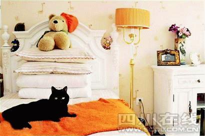 粉紅壁紙、成套白色歐式單人床、床頭柜、落地?zé)簟差^一張大頭照中的黑色貓咪,是這間屋的主人。貓主人專門將一間閑置的客臥打掃出來,用作“女兒”的“閨房”。被子枕頭用不上,但是一兩條名牌的毛毯是必備的。床上的玩具是貓主人去香港迪斯尼玩時(shí)帶回來的駝色小烏龜。