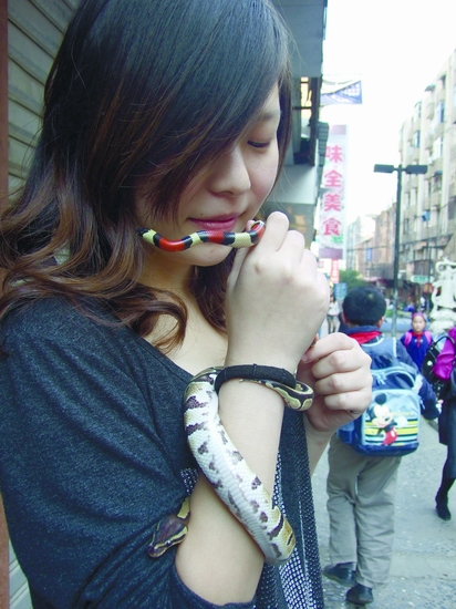 如果在大街上看到寵兒,你一定會覺得她是一個時尚、貌美的美女。如果你仔細(xì)一看,發(fā)現(xiàn)她的手腕上纏著一條色彩斑斕的蟒蛇,會不會立刻將你“雷”倒呢?如今在省城合肥,有不少像寵兒一樣的美女帥哥,他們已經(jīng)不屑于養(yǎng)小貓小狗這樣的平常寵物,而是將各種各樣的蛇當(dāng)作自己的“另類寵物”,甚至和蛇同床共枕,卿卿我我。記者昨天就采訪了這樣幾位“都市潮人”。