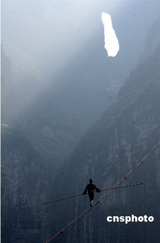 十八日下午一時許,沒有任何保護措施的賽買提手持平衡桿開始向天門山極限坡度發(fā)起挑戰(zhàn)。由于開始階段體能充沛,賽買提在直徑為三點一厘米的鋼索上健步前行,不到十分鐘就走了一百多米。此后的一段時間里,賽買提走得十分小心,不斷地利用平衡桿穩(wěn)定身體。