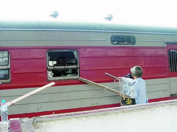 昨日清晨6時57分,由廣州開往長沙的5362次列車到達(dá)長沙車站,?吭谌九_五道。長沙車站派出所民警戴戈與列車乘警辦理完交接手續(xù)后,接到該車行李員陽小華報告,稱當(dāng)日6時許,該次列車到達(dá)株洲裝卸完行李準(zhǔn)備開車時,突然沖上來一名穿白T恤的中年男子,“撲通”一聲跪倒在他面前,稱有人追殺他。同時,該男子手持深圳至婁底的車票。男子上車后一直躲在行李后,充滿恐懼,經(jīng)行李員多方勸解無果。列車終到長沙車站后,該男子將行李員趕下車廂,將行李車廂的正門反鎖,將通道門用貨物堆碼封閉,并手持一根釘有鐵釘、長1.5米的粗木棒揮舞,不許任何人靠近。