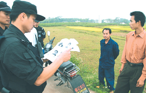 圖為警方在合浦縣白沙鎮(zhèn)瓦窯嶺村的進(jìn)出路口設(shè)卡搜捕“9·18”專案在逃人員