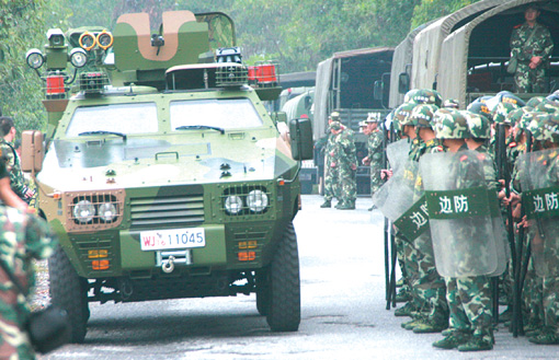 圖為武警裝甲作戰(zhàn)車將警力運(yùn)送到瓦窯嶺村附近 李君光攝