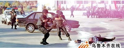 高速公路上,一輛黑色轎車突然沖過(guò)交警卡點(diǎn),警笛響起,頭戴鋼盔、手持微型沖鋒槍的特勤民警快速出擊,嫌疑人向民警開槍時(shí)被“擊斃”……10月21日,新疆高等級(jí)公路交警支隊(duì)進(jìn)行了建隊(duì)十年來(lái),規(guī)模最大的一次快速應(yīng)對(duì)高速路突發(fā)事件演習(xí)。