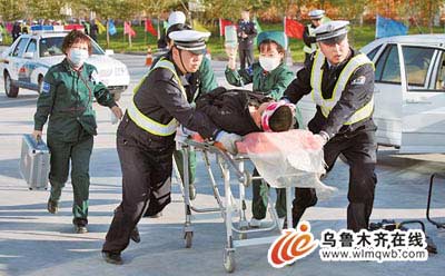 交警和120急救人員展開現(xiàn)場(chǎng)急救運(yùn)送“傷者”。