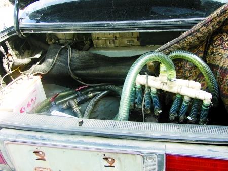 “為了避人耳目,大鐵箱被用布蓋著。鐵箱上連著直徑有5厘米粗、內(nèi)有鐵絲的硬質(zhì)塑料管,五六米長的管子上安裝有閥門、連接有油泵、進(jìn)出油過濾油器、開關(guān)等。原來轎車就是用這根‘長鼻子’把大貨車的油偷走了!崩罹该髡f。