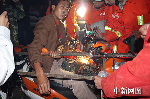 余姚消防大隊(duì)接到報(bào)警后,調(diào)派兩輛消防車9名消防員趕赴現(xiàn)場。在對現(xiàn)場進(jìn)行了警戒之后,余姚消防大隊(duì)的王中隊(duì)長利用機(jī)動液壓擴(kuò)張剪先把插入朱先生體內(nèi)的鋼筋固定后,由另一名消防員用無齒鋸對鋼筋進(jìn)行切割。為讓切割過程中,朱先生免受高溫傷害,消防員在切割時(shí)用水對鋼筋進(jìn)行降溫,在用完整整一瓶礦泉水后,朱先生終于成功被救出,并送上了救護(hù)車。