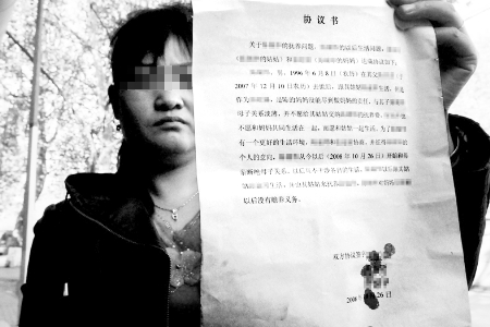 豪豪的姑姑拿著按有三方指印的協(xié)議書(shū)。