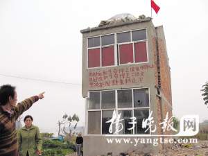 近日,記者來到了位于友誼河路上的七橋甕濕地公園。這處公園占地約1000畝,周圍湖光山色,風(fēng)景很美。工人們正在栽種毛竹,為公園開園做最后的準(zhǔn)備。沒走多久,一幢頂上插著國旗的磚砌2層小樓就出現(xiàn)在記者眼前。走近一看,小樓的正面還用紅漆刷著“用鮮血和生命捍衛(wèi)國家物權(quán)法”、“用鮮血和生命捍衛(wèi)238號文”等“標(biāo)語”,與周圍安逸休閑的自然環(huán)境相比,顯得很是突兀。