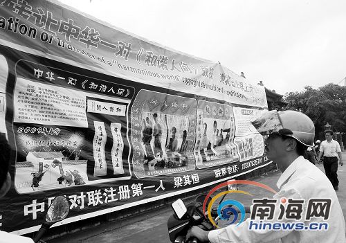 叫賣對聯(lián)版權(quán)的人叫梁其恒,?谑协偵絽^(qū)甲子鎮(zhèn)人。梁其恒告訴記者:“近幾年,農(nóng)村的變化很大,農(nóng)民的生活水平也有了很大提高。自從瓊山合并到?诤螅?谑形姓畬r(nóng)民的生活很重視,相繼解決了農(nóng)民喝水難、行路難等問題。農(nóng)村合作醫(yī)療以及減免義務(wù)教育階段學(xué)生學(xué)雜費(fèi)、課本費(fèi)等政策,使農(nóng)民看病更容易了,醫(yī)藥費(fèi)也更便宜了,孩子們都上得起學(xué)了?吹竭@一切,梁其恒對黨和政府充滿了感激之情,開始尋思著利用一種形式把這種感激之情表達(dá)出來。最后,他選擇了創(chuàng)作對聯(lián)。據(jù)梁其恒介紹,他從2003年3月開始構(gòu)思,前后花了兩年多時(shí)間,不斷修改創(chuàng)新,終于于2005年12月份完成了對聯(lián)《和諧人間》的創(chuàng)作(上聯(lián):錦繡中華與時(shí)俱進(jìn);下聯(lián):濤瀛神州繼往開來;橫聯(lián):和諧人間)!逗椭C人間》創(chuàng)作完成后,梁其恒邀請了海南知名的書法家書寫文字,并自費(fèi)印刷了幾百份,在親戚朋友間發(fā)放。梁其恒說,親戚和朋友們對他的對聯(lián)都很喜歡,還有許多臨高、瓊海等地的外地人也慕名而來,甚至還有人自愿掏錢購買他的對聯(lián)。