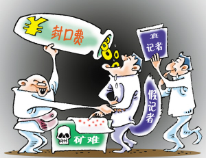 山西省政府新聞辦公室10月29日通報了霍寶干河煤礦記者領取“封口費”事件的調查情況。據(jù)稱,以采訪名義登記并領取“封口費”者,多數(shù)是假冒記者。當?shù)毓俜奖硎,將以這次事件的處理為契機,堅決打擊損害新聞媒體形象的害群之馬。(10月30日《中國青年報》)