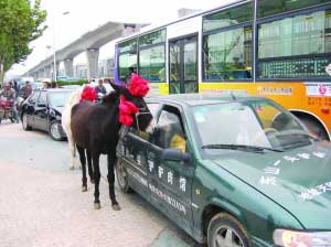 20多歲的李先生拿出手機(jī)一邊拍照,一邊對(duì)身邊的女友說:“毛驢我見過,可在這城市道路上用轎車牽毛驢,我算是第一次見,真好玩!”由于轎車與兩頭毛驢占據(jù)了不止一股車道,加上行進(jìn)緩慢,結(jié)果毛驢所到之處,交通很快陷入無序。騎車的路人及行人見了,也紛紛圍上來看熱鬧,現(xiàn)場(chǎng)一片混亂。