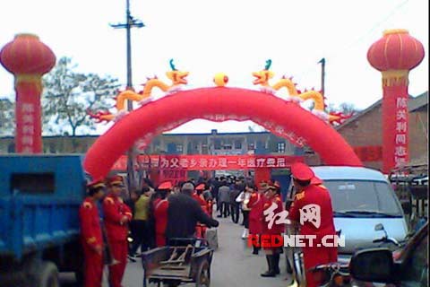 非常隆重,標(biāo)語有:某某個(gè)人為父老鄉(xiāng)親辦理一年醫(yī)療費(fèi)用……
