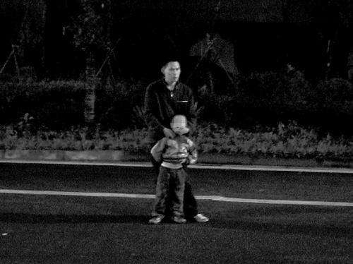 一名中等身材、瘦削的男子站在公平街辦建安社區(qū)5組路口對(duì)面的龍新路快車道上,身前緊挨著站著一名小男孩。據(jù)稱,小男孩就是持刀男子的親生兒子、5歲的小明(化名)。男子右手緊握一把20多厘米長的尖刀,刀刃緊貼著小明的脖子,不時(shí)在快車道上來回走動(dòng),還左右張望,十分警惕。一名戴眼鏡男子站在持刀男子對(duì)面三四米外,正在與當(dāng)?shù)嘏沙鏊窬嗫谄判牡貏裾f男子放開劫持的小男孩。戴眼鏡男子是持刀男子的大哥。