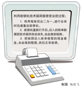 楊某說(shuō),在必勝客店,允許當(dāng)天賬面與收款額有千分之二的偏差。他嘗到“甜頭”后膽子漸漸大了起來(lái)。此后,根據(jù)營(yíng)業(yè)情況,他幾乎每次當(dāng)班都利用收銀機(jī)的技術(shù)漏洞銷(xiāo)賬拿錢(qián),一天少則兩三百元,多則六七百元。